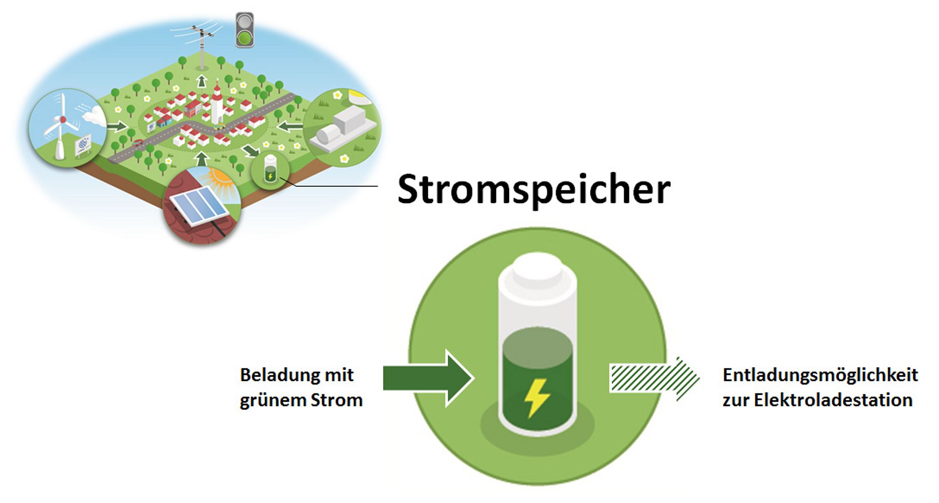 Wind und Sonne sind intermittierende Energiequellen. Der Wind weht nicht mit konstanter Geschwindigkeit und manchmal herrscht Windflaute. Die Sonneneinstrahlung ist auch nicht konstant. Sie hängt von der Tages- und Jahreszeit und dem Bedeckungsgrad durch Wolken ab. Mit einem Stromspeicher kann man trotzdem zu jeder Zeit grünen Strom aus diesen intermittierenden Energiequellen bereitstellen. Der Stromspeicher wird bei einem Überschuss an Photovoltaik- oder Windenergie geladen. Die Entladung findet ausschließlich bei einem Mangel an grüner Energie statt. Elektrofahrräder und Elektrofahrzeuge können deshalb auch nachts und bei einer Windflaute mit grünem Strom betankt werden.